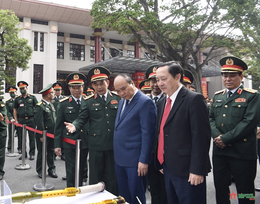 Chủ tịch nước Nguyễn Xuân Phúc và lãnh đạo Bộ Quốc phòng cùng các đại biểu tham quan một số sản phẩm về khoa học và công nghệ thuộc lĩnh vực quân sự-quốc phòng. (ảnh: Báo Quân đội Nhân dân)