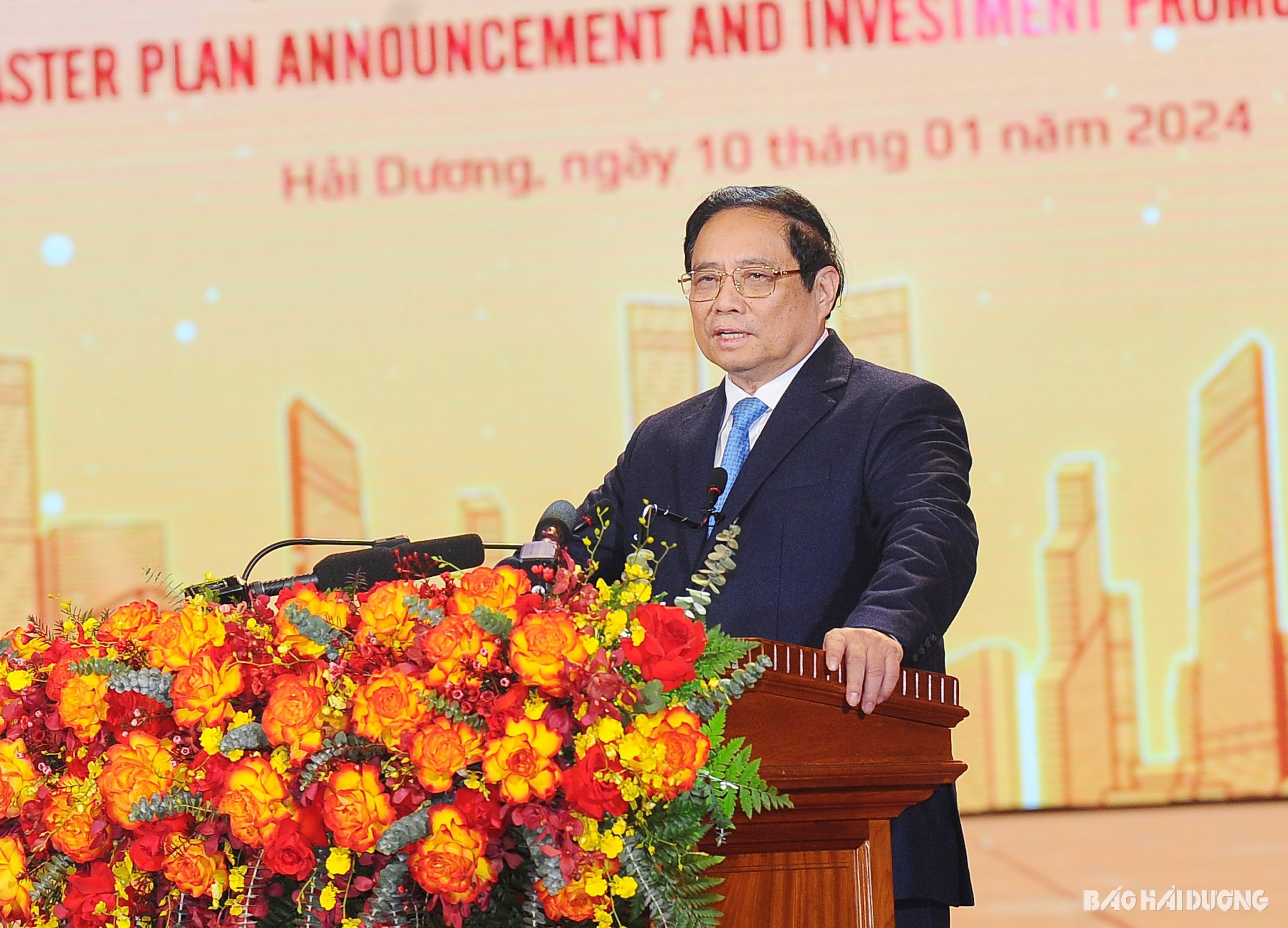 Khái quát các yếu tố nền tảng, tình hình phát triển kinh tế-xã hội và môi trường đầu tư của cả nước, Thủ tướng Chính phủ Phạm Minh Chính đánh giá cao những đóng góp của tỉnh Hải Dương vào thành tựu chung. Trước “những cơn gió ngược”, tỉnh vẫn đạt được nhiều kết quả nổi bật. Các lĩnh vực đều tăng trưởng cao, đặc biệt hoạt động đầu tư đạt kết quả tích cực. Thủ tướng Chính phủ nhấn mạnh Việt Nam có nền tảng kinh tế, chính trị, xã hội ổn định và ngày càng phát triển, là điểm đến hấp dẫn của các nhà đầu tư, hội nhập quốc tế được đẩy mạnh chính là điều kiện rất thuận lợi cho các địa phương, nhất là tỉnh Hải Dương nằm trong khu vực trọng điểm, động lực kinh tế. Hải Dương có vị trí quan trọng nằm ở trung tâm đồng bằng Bắc Bộ; có hệ thống giao thông thuận lợi cả về đường bộ, đường sắt, đường thủy. Đó là nền tảng căn bản trong phát triển công nghiệp, lợi thế về nông nghiệp, điều kiện thuận lợi trong du lịch và lực lượng lao động lớn, có trình độ chuyên môn cao. Đảng bộ, chính quyền tỉnh thể hiện quyết tâm cao, đổi mới tư duy, sáng tạo trong cách làm, nhất là cách tiếp cận mới trong việc xác định chiến lược phát triển. Đặc biệt, quy hoạch tỉnh Hải Dương được công bố hôm nay có ý nghĩa rất quan trọng, tạo không gian phát triển mới, thúc đẩy các ngành, lĩnh vực phát triển bền vững, hiệu quả; giúp khai thác, phát huy tối đa tiềm năng, thế mạnh của tỉnh. Do đó, Hải Dương hội tụ nhiều tiềm năng khác biệt, cơ hội nổi trội, lợi thế cạnh tranh để phát triển kinh tế-xã hội nhanh và bền vững, là điểm đến hấp dẫn đối với các nhà đầu tư trong nước và quốc tế, tạo động lực phát triển cho tỉnh và lan tỏa cho vùng đồng bằng sông Hồng và cả nước.