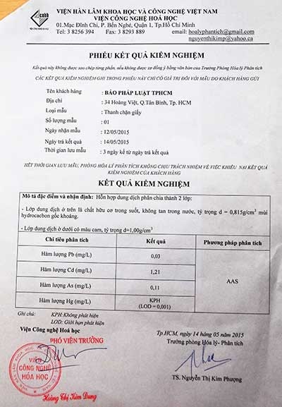 Gần đây Báo Pháp Luật TP.HCM đã mang mẫu kiểm tra Thanh chặn giấy, kết quả cho thấy sản phẩm có chứa các chất độc hại nguy hiểm tới sức khỏe như kim loại nặng, asen, Cd...
