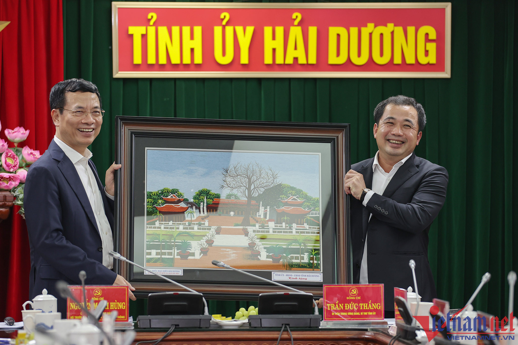 Bí thư Tỉnh uỷ Hải Dương Trần Đức Thắng tặng tranh cho Bộ trưởng Nguyễn Mạnh Hùng. Ảnh: Lê Anh Dũng